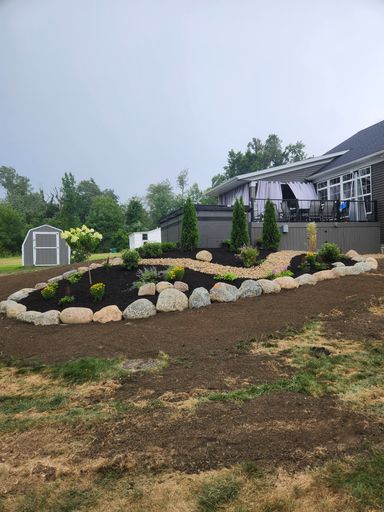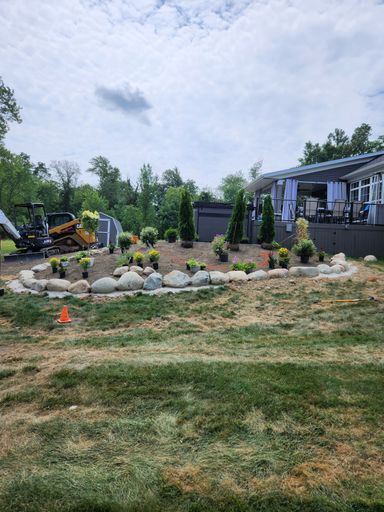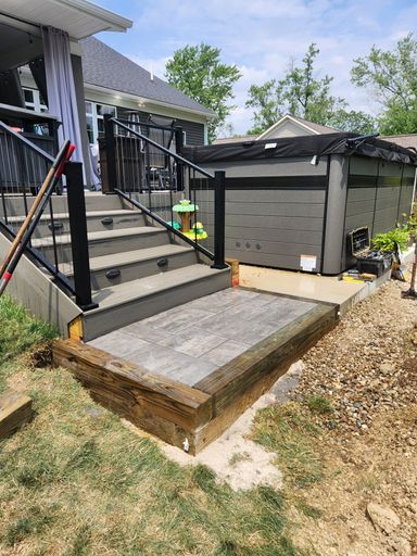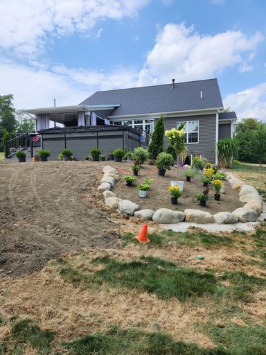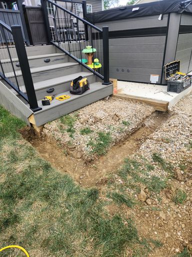 A complete landscape install in Twinsburg, Ohio. In this project we had to haul in dirt and gravel to build the pad for the lap pool, install the landing pad for the stairs, and provide a full landscape bed to help blend in the hill side.